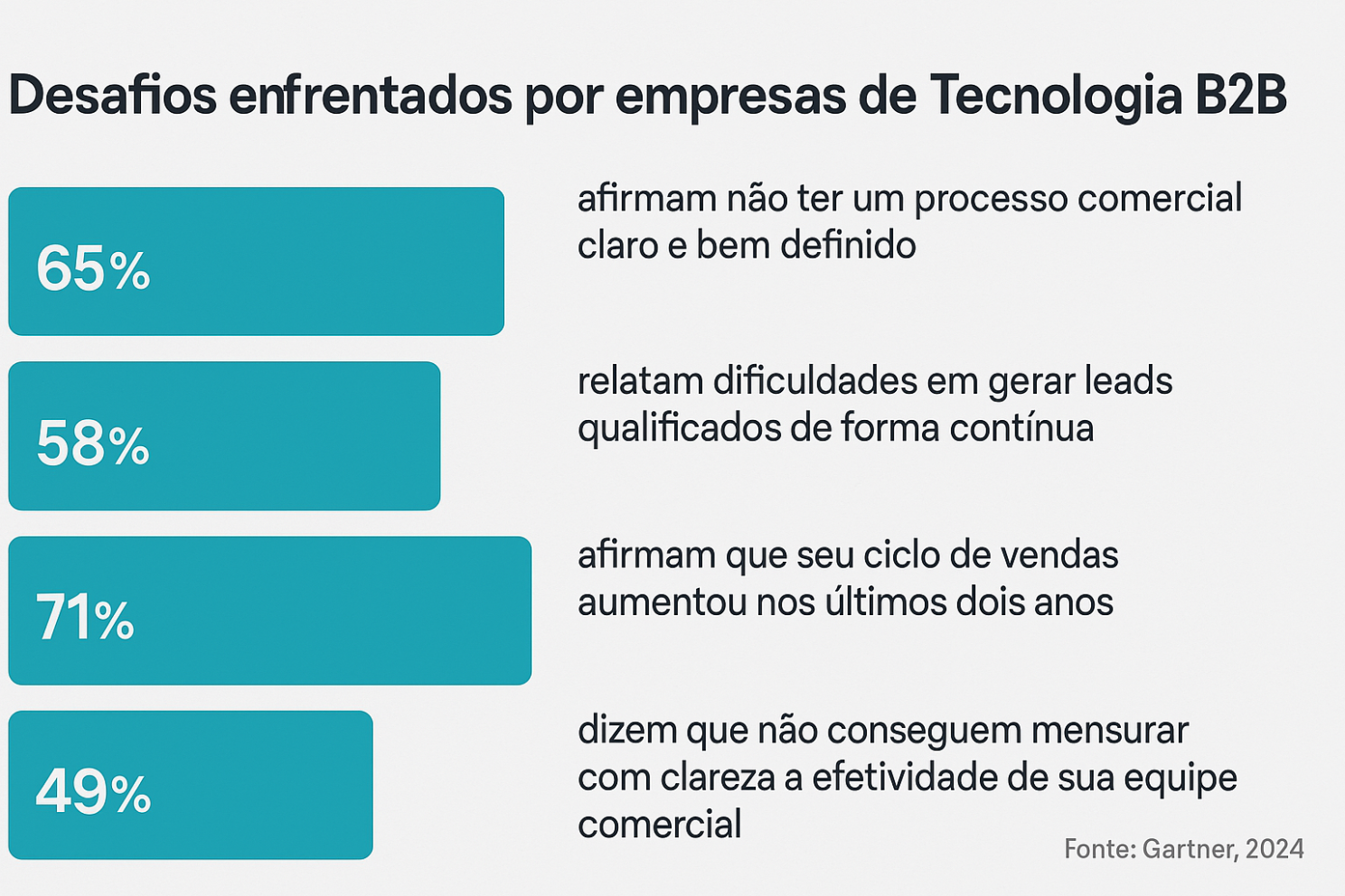 De acordo com dados recentes da Gartner (2024), mais de 65% das empresas de tecnologia B2B afirmam que não possuem um processo comercial claro e bem definido. Além disso: